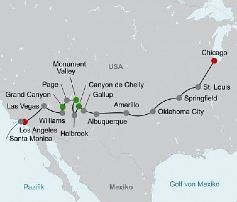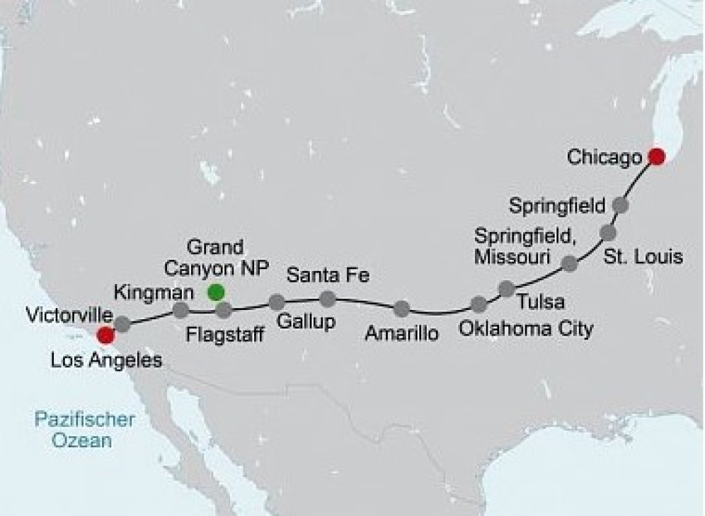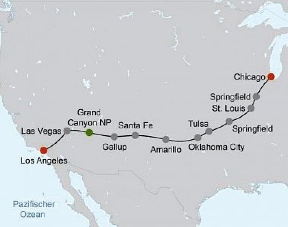 Route: Chicago – Springfield – St. Louis – Tulsa – Oklahoma City – Amarillo – Santa Fe – Gallup – Grand Canyon Nationalpark – Las Vegas – Los Angeles