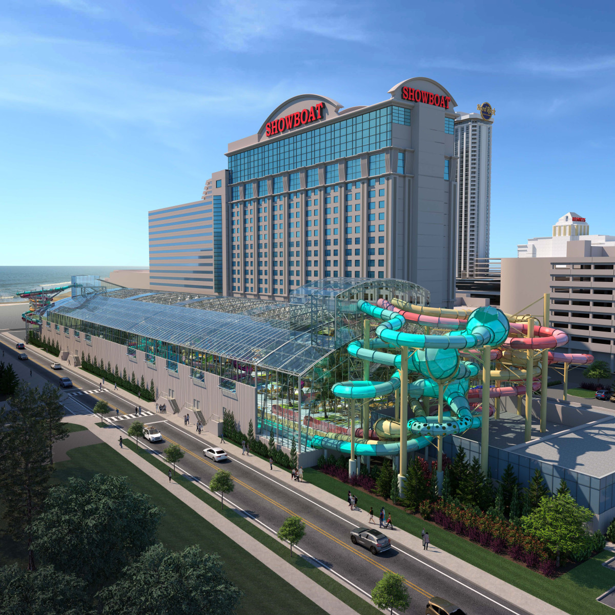 Ein großer Vorteil: Du musst nicht einmal das Gebäude verlassen, denn der Wasserpark ist direkt mit dem Showboat Hotel verbunden. So kannst Du Dich nach einem ausgiebigen Badetag ganz bequem aufs Zimmer zurückziehen, trockene Kleidung anziehen und den Abend in einem der nahegelegenen Restaurants oder am Boardwalk ausklingen lassen.