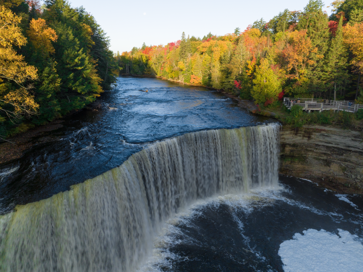 Heute stehen die gewaltigen Tahquamenon Falls im Mittelpunkt. Ein idyllischer Wanderweg, umgeben von alten Zedern, Hemlocktannen und herbstlicher Wildnis, verbindet die Lower und Upper Falls entlang des Flusses. Der Kontrast zwischen dem ruhigen Wald und den kraftvollen Wasserfällen macht diesen Abschnitt besonders eindrucksvoll.
