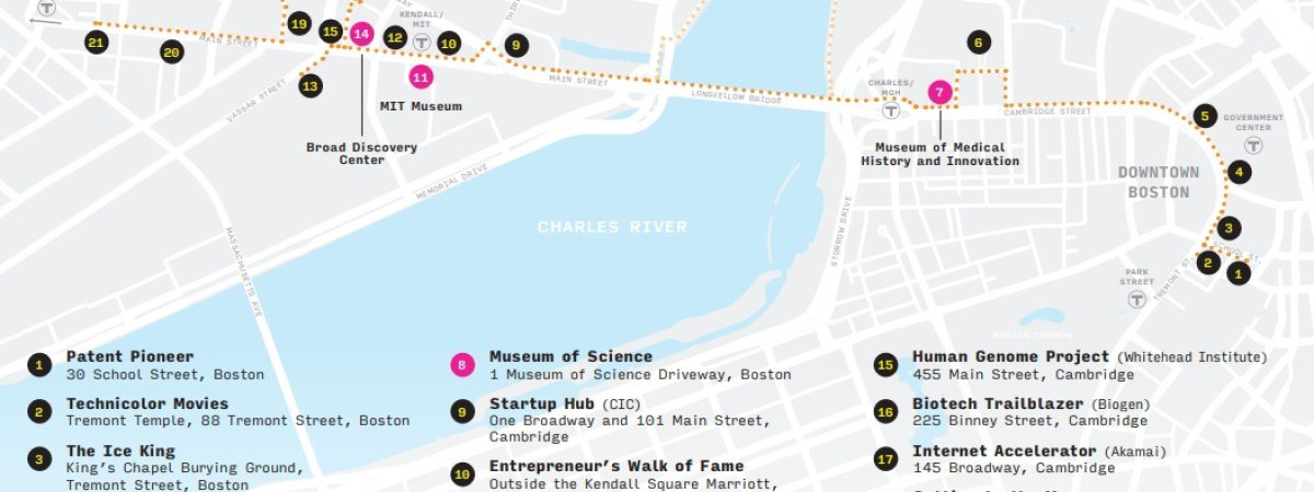Du kannst den Innovation Trail in Downtown Crossing, in der Nähe des Irish Famine Memorial und des Old South Meeting House, oder in Cambridge in der Nähe des Central Square beginnen.