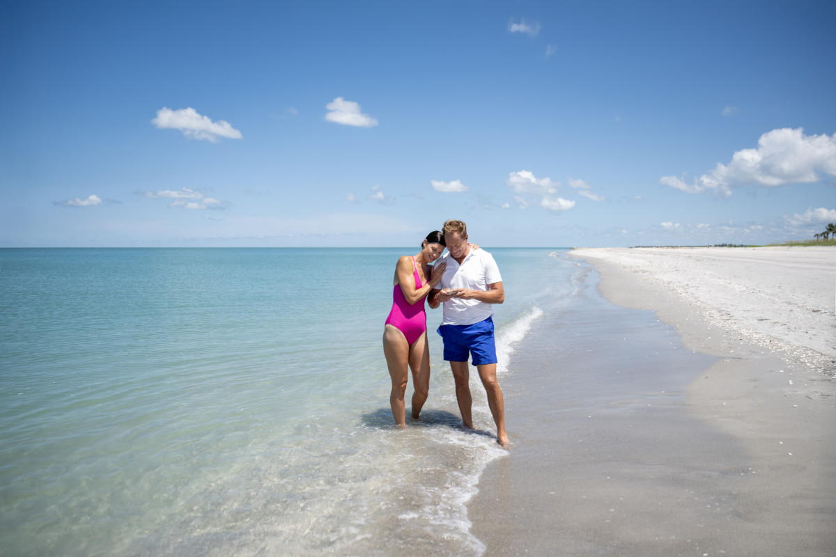 Wenn die Sonne in goldenem Licht über dem Golf von Mexiko untergeht, entsteht hier pure Magie. Ideal für romantische Strandaufnahmen – und vielleicht mit einem kleinen Souvenir: den unzähligen Muscheln, die den Strand schmücken.