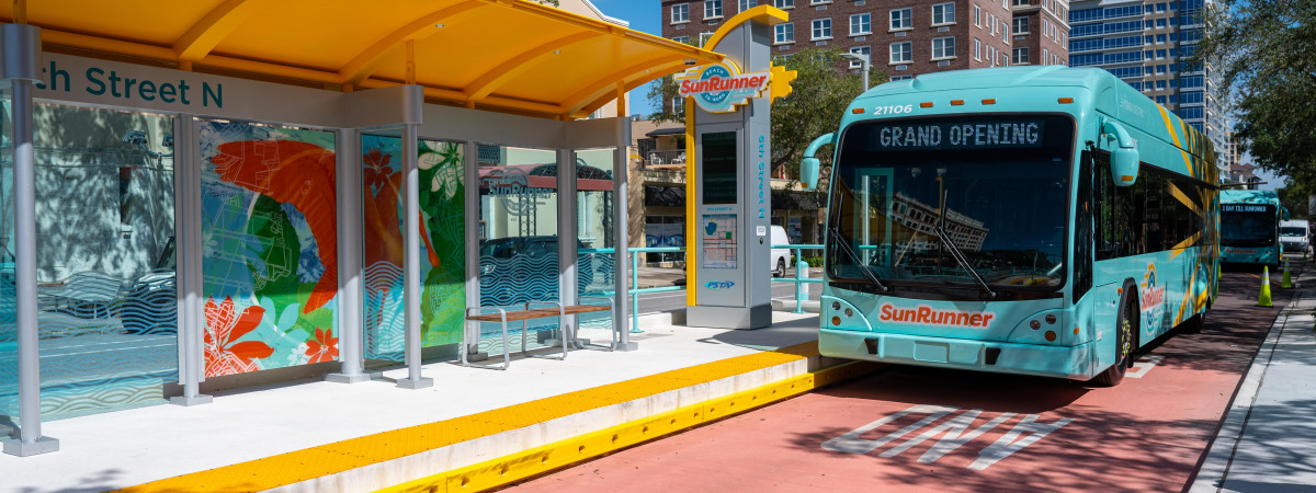 Die SunRunner Busse verfügen über kostenfreies WIFI und ermöglichen es zudem Fahrräder mitzunehmen. Von außen machen die Busse ihrem Namen alle Ehre, da sie vom örtlichen Künstler Chad Mize gestaltet wurden, der auch mehrere Urban Murals in Downtown St. Pete entworfen hat.