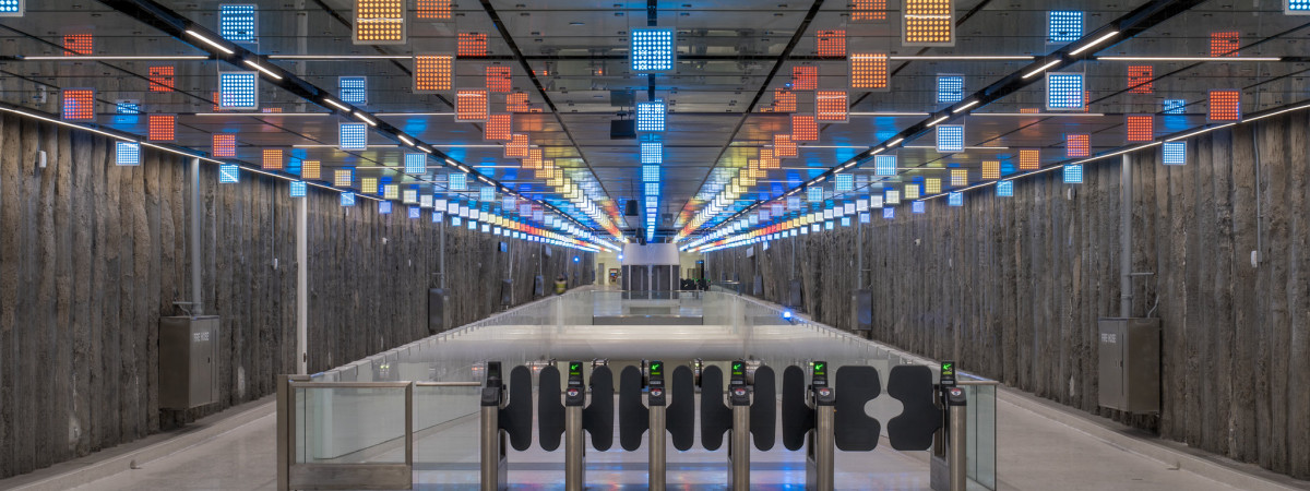 Neue Metro-Stationen werden zum Kunst-Hotspot Ein Hingucker der neuen Haltestelle Union Square/Market Street ist „Lucy in the Sky“, ein Werk des niederösterreichischen Künstlers Erwin Redl. Seine Lichtkunstinstallation besteht aus über 500 Lichtpaneelen, die über die gesamte Decke der Concourse-Ebene aufgehängt sind. Die Paneele ändern immer wieder die Farbe, um neue Bilder anzuzeigen. An den neuen Stationen können auch weitere Kunstwerke bestaunt werden. Lucy_in_the_Sky_CentralSubway_UnionSquareMarketStation_PhotoCredit_EthanKaplan_SanFranciscoArtsCommission.jpg