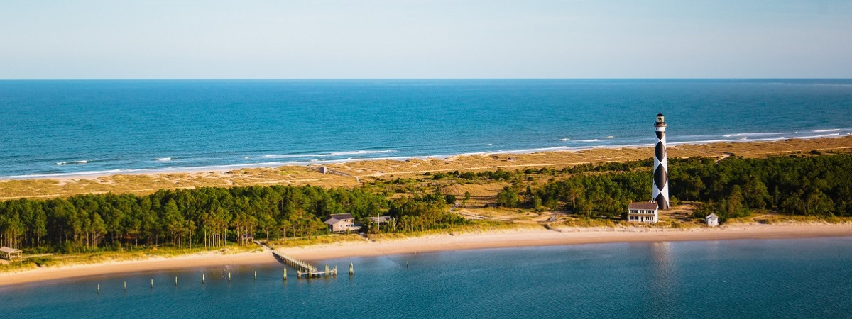 Im Osten erstreckt sich die Küstenregion knapp 500 Kilometer entlang des Atlantiks und wird von den vorgelagerten Düneninseln Outer Banks bestimmt. 1903 schrieben die Gebrüder Wright Luftfahrtschichte, indem sie dort den ersten motorisierten Flug absolvierten. Heute ist North Carolinas Küste mit idyllischen Städtchen, vielen ikonischen Leuchttürmen, weiten Sandstränden, zwei National Seashores und zahlreichen Golfplätzen ein Anziehungspunkt für Erholungssuche sowie Sportgebegeisterte. Zu den Besuchermagneten zählen weiterhin die auf den Outer Banks heimischen Wildpferde.