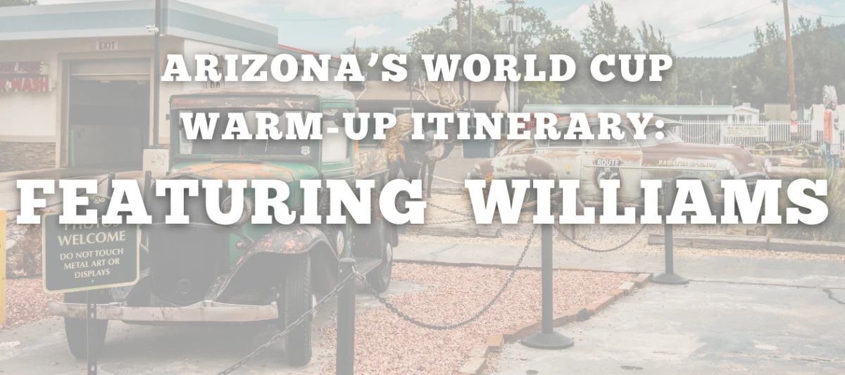 Starten Sie Ihr WM-Abenteuer in Arizona! Williams liegt 2,5 Stunden nördlich des internationalen Flughafens Phoenix Sky Harbor, der derzeit über 20 internationale Ziele anfliegt und mit einer durchschnittlichen Wartezeit von weniger als 8 Minuten zu den Flughäfen mit der schnellsten Zollabfertigung in den USA zählt. Diese Reiseroute ist der perfekte Abstecher zwischen den Spielen. Erleben Sie die Route 66 in Williams, Arizona – der letzten Stadt, an der die Interstate 40 vorbeiführt. Williams, bekannt als das „Tor zum Grand Canyon“, hat alles zu bieten: Outdoor-Abenteuer, sechs Blocks gut erhaltener Route 66, einzigartige Attraktionen, die man buchen kann, und die Grand Canyon Railway. Schau dir unseren Reiseplan im Anhang an!AZs World Cup Warm Up (2) (1).pdf2.68 MB