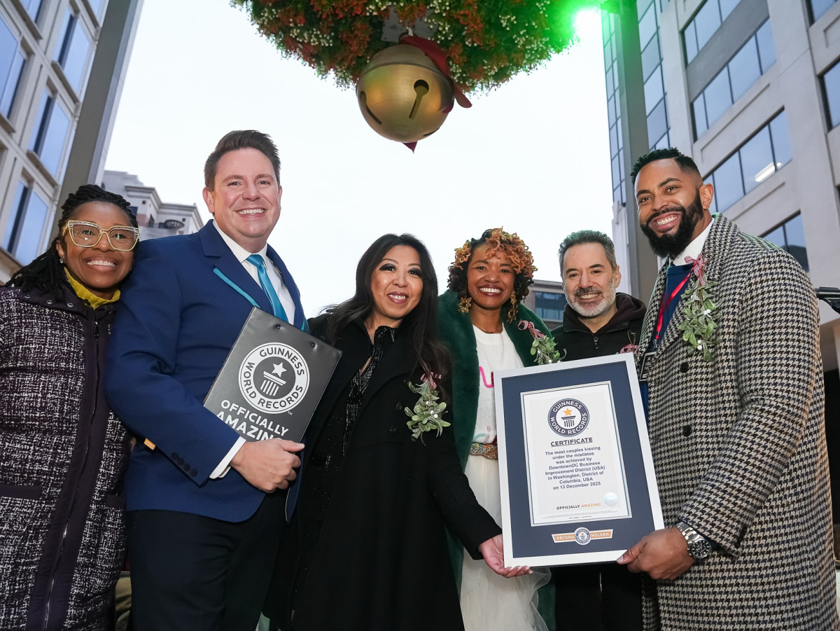 Dass Küssen verbindet, ist hinlänglich bekannt. Dass es gleich 1.435 Paare gleichzeitig tun, dagegen eher selten. Am letzten Samstag, dem 13. Dezember 2025, verwandelte sich die Anthem Row in Downtown Washington, DC in die wohl romantischste Adresse der US-Hauptstadt. Unter der drei Meter großen, schwebenden Kugel aus Mistelzweigen, dem traditionellen National Mistletoe, küssten sich die Paare fünf Sekunden lang und stellten damit einen neuen GUINNESS WORLD RECORDS™ auf, der von offiziellen Vertretern noch vor Ort bestätigt wurde. Sie übertrafen damit den bisherigen Weltrekord von 480 Paaren deutlich. Rund um den großen Moment wurde mit Musik, Essen und Getränken, weiteren Fotoaktionen sowie jeder Menge guter Laune gefeiert.