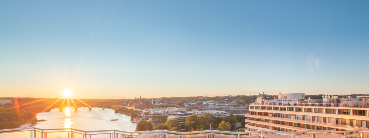 Top of the Gate im Watergate Hotel. Neben dem wundervollen Blick auf den Fluss lassen sich auch die Key Bridge und die Theodore Roosevelt Bridge sowie das Washington Monument erspähen.
