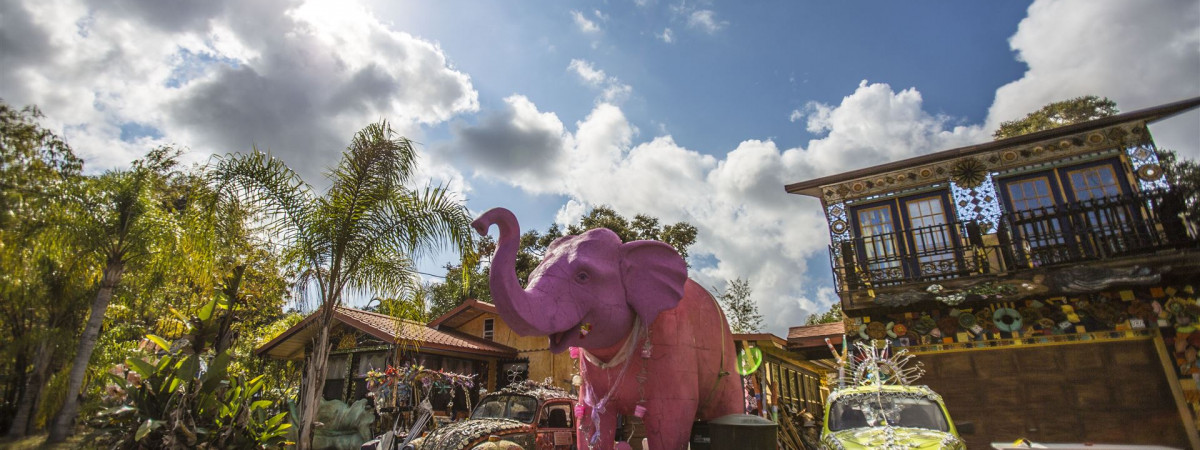 Safety Harbor Art & Music Center zu sehen, wo die Besucher schon vor dem Tor von einer lebensgroßen, mit Mosaiken verzierten Elefantenskulptur begrüßt werden.