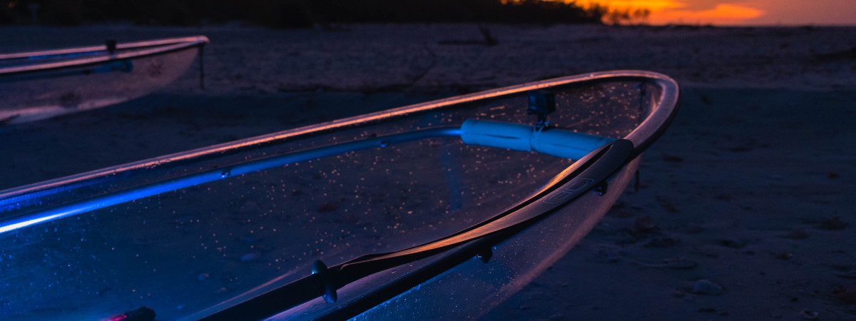 Das Besondere daran? Die Reisenden sitzen in einem durchsichtigen Kajak. Es ist tatsächlich durchsichtig wie Glas. Doch zum Glück nicht so zerbrechlich, denn der Boden ist aus stabilem Plexiglas gefertigt und eröffnet eine faszinierende Welt, die dem normalen Florida-Besucher normalerweise verborgen bleibt. Und heute Abend, bei der „Glow Tour“ durch die Mangroven von St. Pete-Clearwater, wird diese Welt in farbiges Licht getaucht: Bunte LED-Leuchten am Rumpf des Kajaks lassen das Wasser unter den Paddeln in Türkis, Lila und Neonblau erstrahlen – wie ein Aquarium unter Sternen.