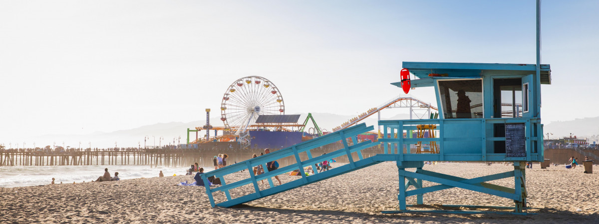 Zu einem Besuch in Santa Monica gehört natürlich auch der Santa Monica Pier, das Wahrzeichen der Stadt und der älteste seiner Art an der Westküste. Auf dem Pier findet man das erste solarbetriebene Riesenrad, ein Karussell, eine Achterbahn sowie zahlreiche Restaurants, Snackbars und Straßenkünstler.