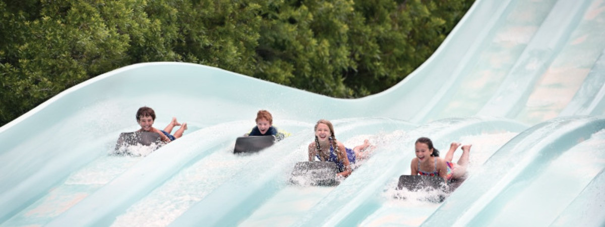 - Diese Mega-Rutsche verspricht wilden Wasserspaß. Da Adrenalin pumpt garantiert durch den Körper, wenn es für jeweils vier Personen auf ihrem "Kleeblatt" zuerst durch einen Trichter und dann durch eine eine lange Röhre geht, bevor sie hoch über dem Park ins Wasser "schießen".