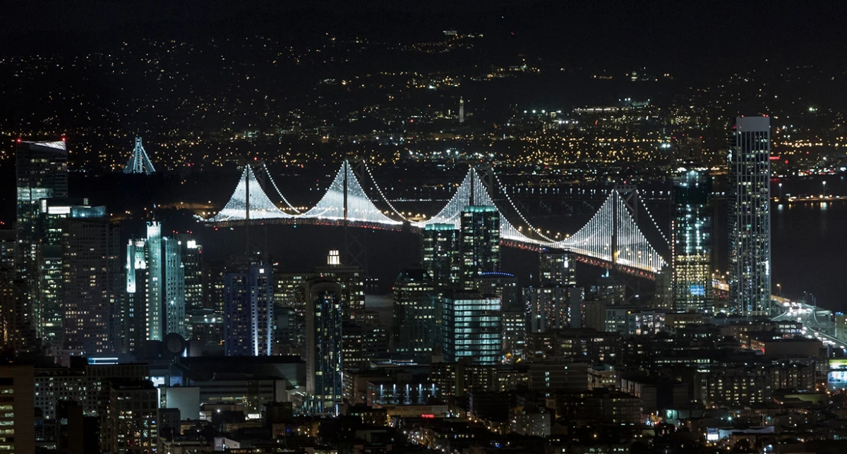 1989 zeigte die Erde, wer der Stärkere ist. Damals stürzte der östliche Teil der Bay Bridge ein. Ingenieure bauten daraufhin einen faktisch erdbebensicheren Nachfolger – dieser wurde 2013 fertig gestellt. Bis dahin führte die Bay Bridge ein Schattendasein im Vergleich mit der berühmten Golden Gate Bridge. Das sollte sich mit der Lichtinstallation durch den Künstler Leo Villareal schlagartig ändern.