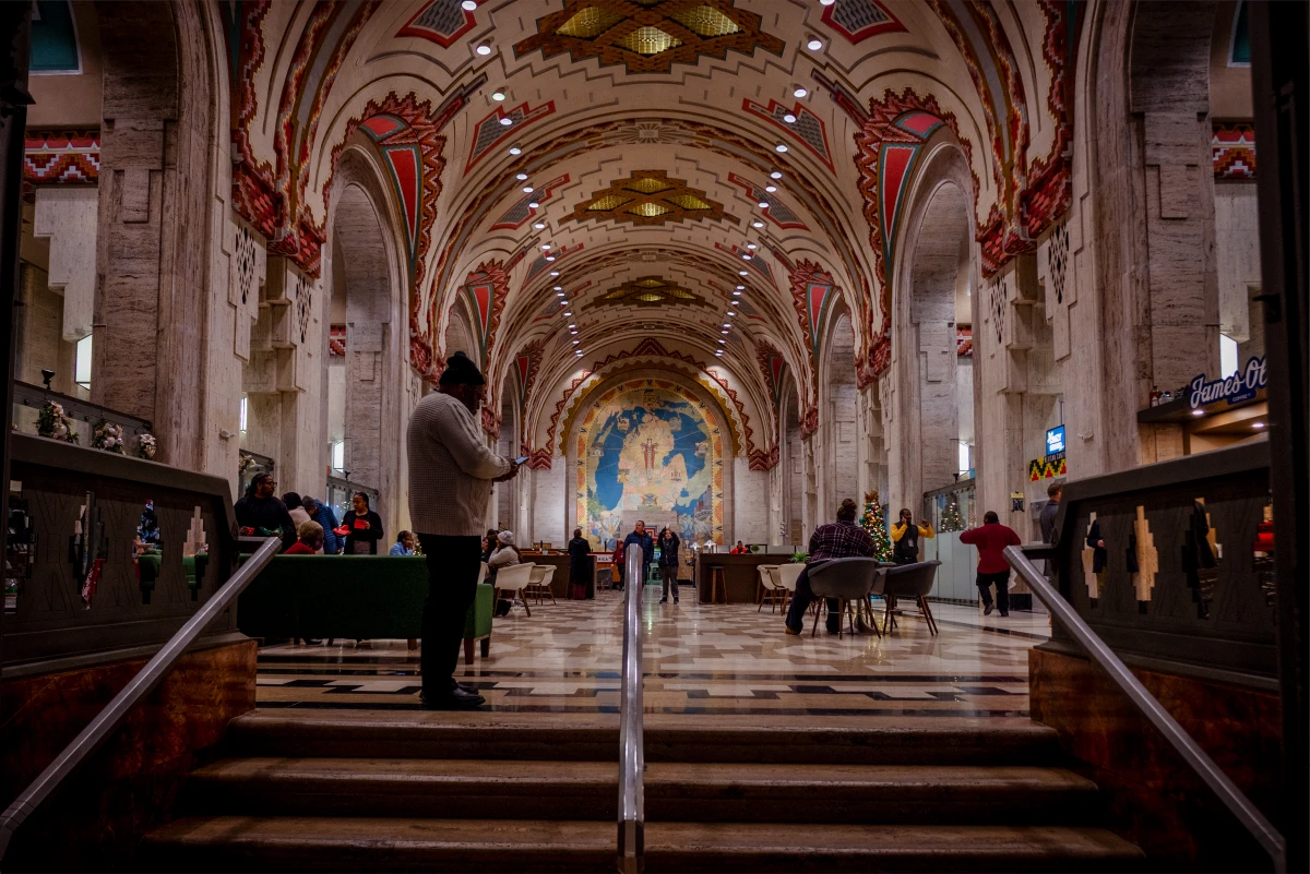 In der imposanten Eingangshalle laden Cafés und kleine Geschäfte zum Verweilen ein, während die detailreiche Gestaltung noch immer den Glanz vergangener Zeiten widerspiegelt.
