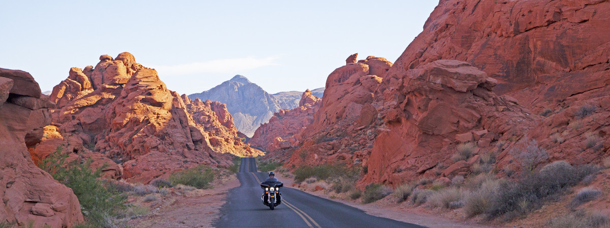 „Das Tal des Feuers” ist ein Paradies für jeden Motorradfahrer, Wohnmobilurlauber und Outdoor-Fan. Der älteste State Park Nevadas erhielt seinen Namen wegen den feuerroten Sandsteinformationen und Dünen der Mojave Wüste. Bei reflektierendem Sonnenlicht machen sie den Anschein zu glühen. Schon bei einer Fahrt durch das Valley of Fire, etwa 80 Kilometer nord-östlich von Las Vegas, kann man die feuerroten Felsen hautnah erleben. Der Parkeintritt wird pro Fahrzeug berechnet, welcher am Eingang bezahlt werden muss.