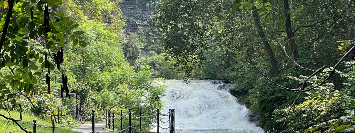 Der Cascadilla Gorge Trail ist eines der bestgehüteten Geheimnisse von Ithaca. Er führt über sechs versteckte Wasserfälle und verbindet das Wohngebiet der Stadt mit der Cornell University. Das ursprünglich erhaltene und 1909 der Cornell University geschenkte Wegesystem wurde 1928, also vor fast 100 Jahren, angelegt. Heute können Besucher in den warmen Monaten den Weg über historische Steinstufen und -treppen begehen und dabei den Blick auf uralte geologische Formationen genießen.