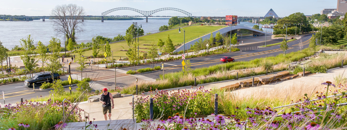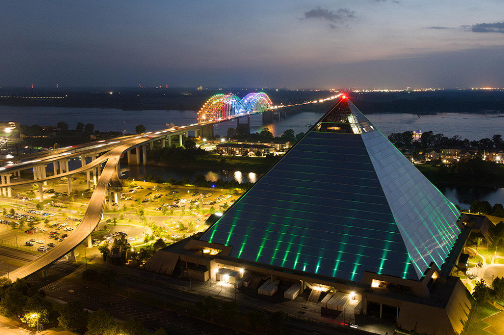 Mit dem Aufzug hinauf auf eine moderne Pyramide: Memphis ist nach einer Stadt des alten Ägypten benannt. Also steht auch hier eine Pyramide. Die ist aber aus Stahl und Glas ans Ufer des Mississippi gebaut; der Nil lässt grüßen. Im größten freistehenden Lift der USA geht es hinauf zur Aussichtsplattform mit dem Panorama der Stadt am Strom. Und unter der Spitze hängt innen das Hotel Cypress Lodge.