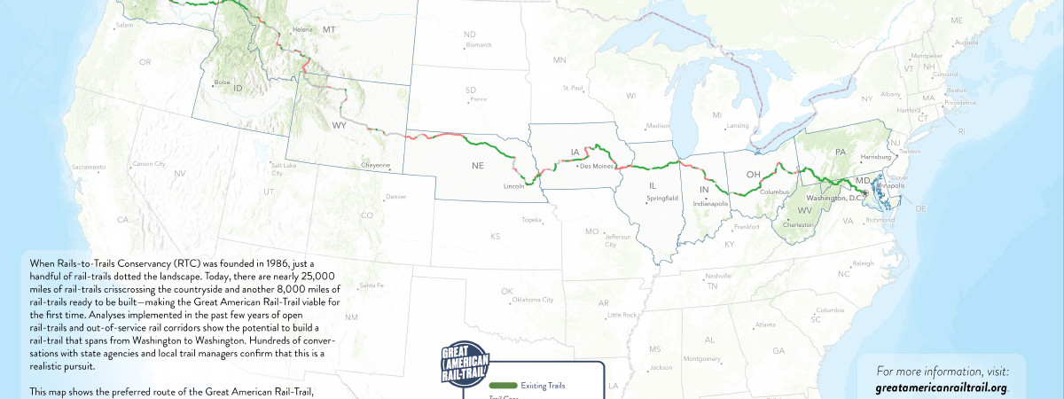 Der Great American Rail-Trail erstreckt sich über 6000 Kilometer quer durch die Vereinigten Staaten und hat alte, stillgelegte Eisenbahnlinien in Mehrzweckstrecken umgewandelt. Der Great American Rail-Trail reicht von La Push, am Pazifik bis Washington D.C. am Atlantischen Ozean.