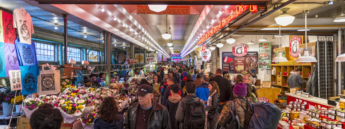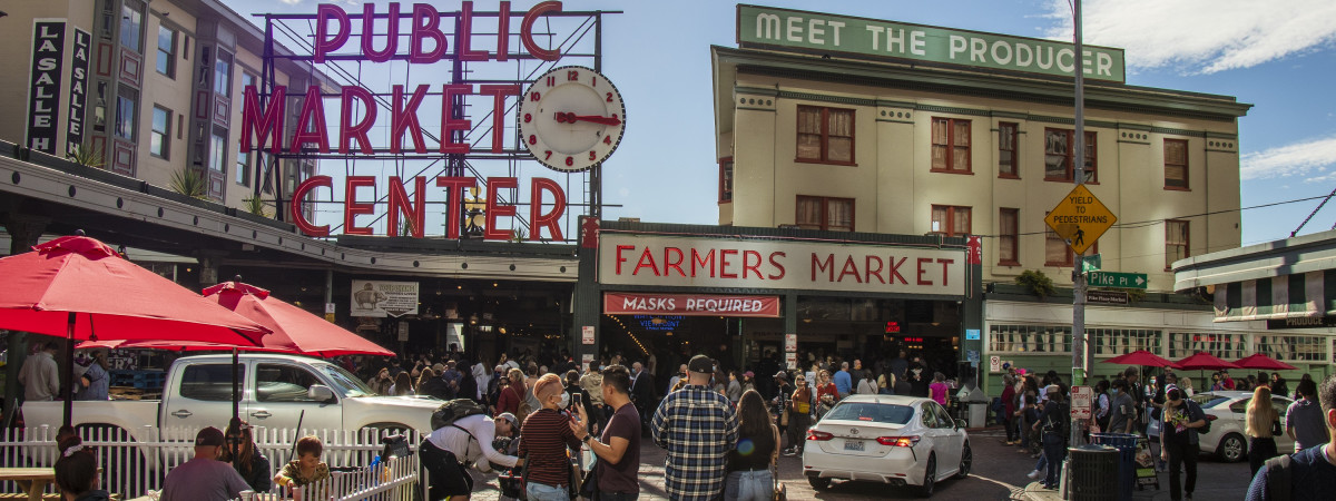 Einst 1907 eröffnet, ist der Pike Place Market seit über einem Jahrhundert fester Bestandteil Seattles und einer der ältesten Bauernmärkte der USA. Besucher können bei einem Spaziergang die bunte Vielfalt frischer Lebensmittel genießen, Fische fliegen sehen, einen bunten Strauß Blumen zusammenstellen oder Kunsthandwerk bestaunen. Wer möchte, kann sich in die Warteschlange vor der Ur-Starbucks-Filiale einreihen, sich mit Sparschwein Rachel fotografieren lassen oder einheimischen Musikern lauschen. Der Pike Place Market beherbergt auf seinen rund 36.500 Quadratmetern mittlerweile mehr als 500 kleine, unabhängige Läden.